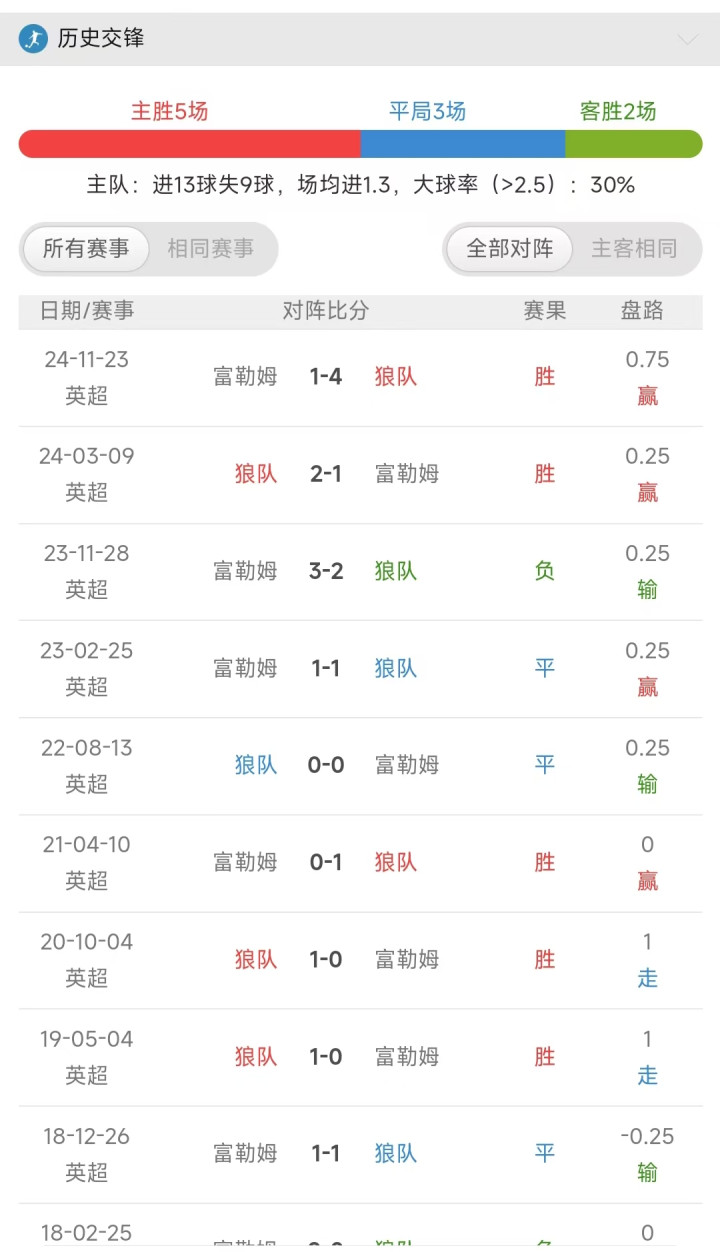 历史交锋中呢,双方近六次交手。狼队是拿下了3胜2平1负的成绩。同时他是打进了10球,就是6球啊。历史交锋中狼队稍稍占据差距。
